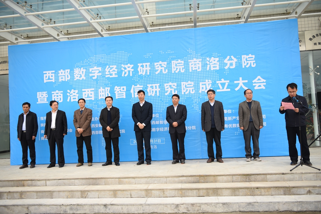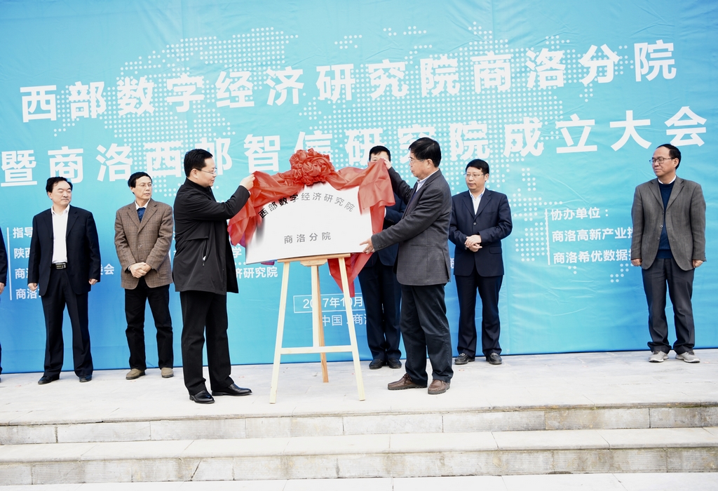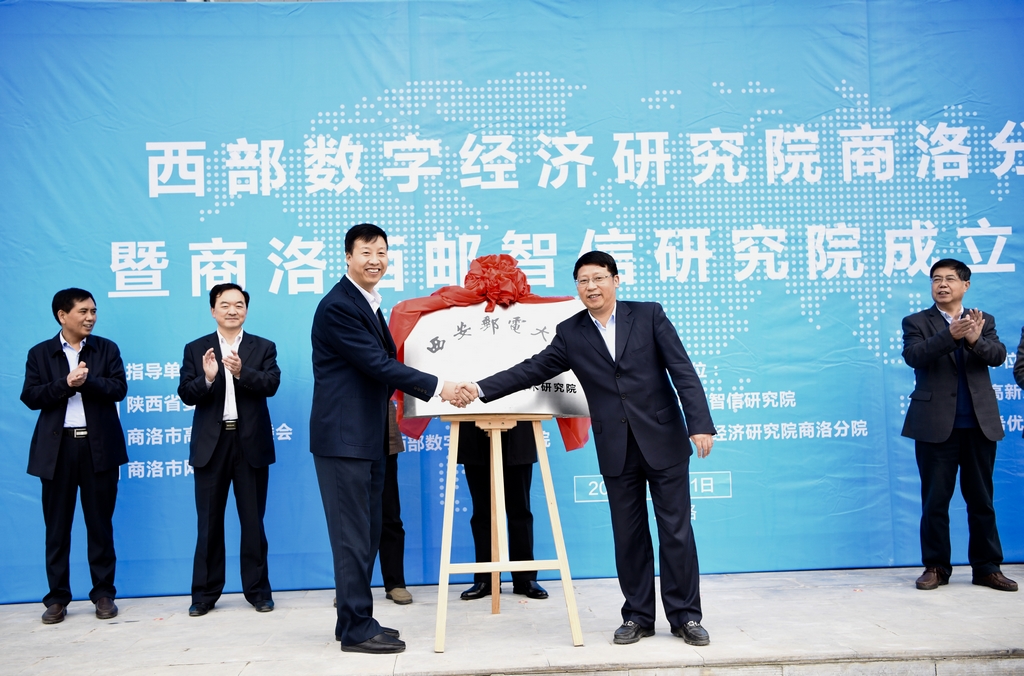 本网讯 10月31日下午,西部数字经济研究院商洛分院暨西邮智信研究院在商洛高新区正式成立。商洛市委秘书长周和斌、陕西省网信办网络经济处副处长陈鹏飞、必赢副校长安增旺、数字经济研究院院长张鸿共同为“两院”揭牌。