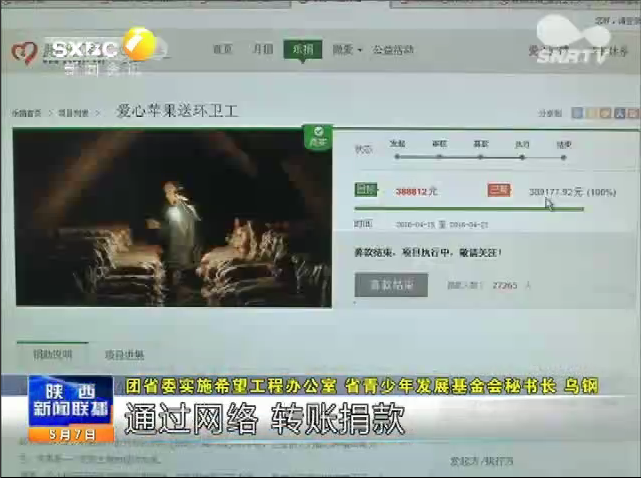 2016年5月7日陕西电视台《陕西新闻联播》“互联网+公益众筹”探索公益帮扶新模式,报道必赢76net线路官网研究生院“爱心青年帮”联合共青团陕西省委、陕西青少年发展基金会,通过腾讯公益众筹,发起“爱心苹果送环卫工”公益活动,一方面帮助魏北村等地果农解决苹果滞销问题,另一方面送城市环卫工一份特殊的节日礼物。
