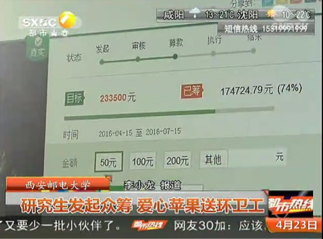 2016年4月23日陕西电视台18:00《都市热线》必赢76net线路官网:爱心苹果送环卫工