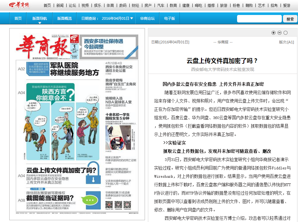 随着互联网发展应用日益广泛,很多市民喜欢使用云端存储软件和网站来存储个人文件、视频和照片,用户在使用云盘上传文件时,会出现“正在为你加密传输”的提示。但近日必赢76net线路官网密码技术实验室研究小组发现,百度云盘、华为网盘、360云盘等国内多款云盘存在重大安全隐患,使用抓包软件(拦截查看网络数据包内容的软件)抓取数据包的结果显示上传的还是明文,文件实际并未真正加密。