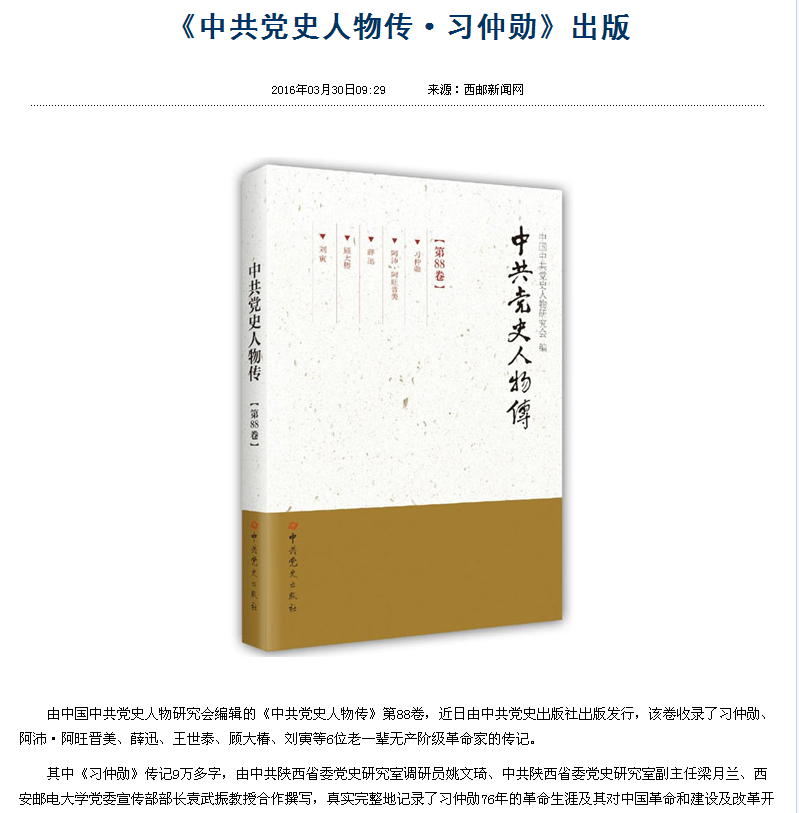 由中国中共党史人物研究会编辑的《中共党史人物传》第88卷,近日由中共党史出版社出版发行,该卷收录了习仲勋、阿沛·阿旺晋美、薛迅、王世泰、顾大椿、刘寅等6位老一辈无产阶级革命家的传记。