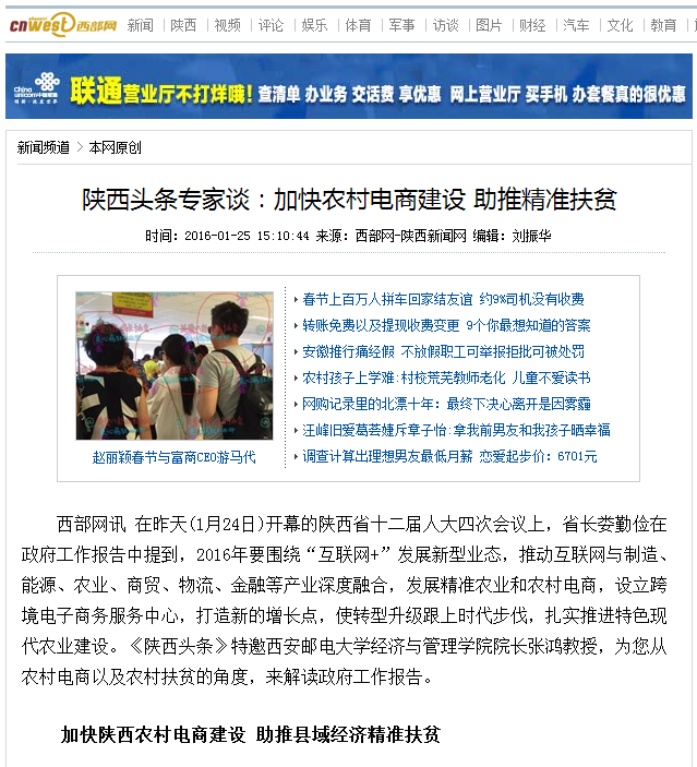 西部网讯 在昨天(1月24日)开幕的陕西省十二届人大四次会议上,省长娄勤俭在政府工作报告中提到,2016年要围绕“互联网+”发展新型业态,推动互联网与制造、能源、农业、商贸、物流、金融等产业深度融合,发展精准农业和农村电商,设立跨境电子商务服务中心,打造新的增长点,使转型升级跟上时代步伐,扎实推进特色现代农业建设。《陕西头条》特邀必赢76net线路官网经济与管理学院院长张鸿教授,为您从农村电商以及农村扶贫的角度,来解读政府工作报告。