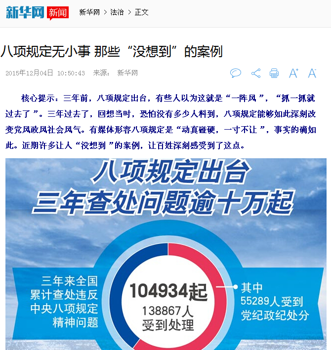 然而,有人议论,仅仅因为违规使用公车、办公用房超标就一次性处分这么多人,有点冤……由此观之,同情因违反中央八项规定精神而被处分者仍有一定“市场”。屈指一算,中央出台八项规定已近3年,仍有人对中央贯彻八项规定精神的决心持怀疑态度,不禁让人心生感慨。
