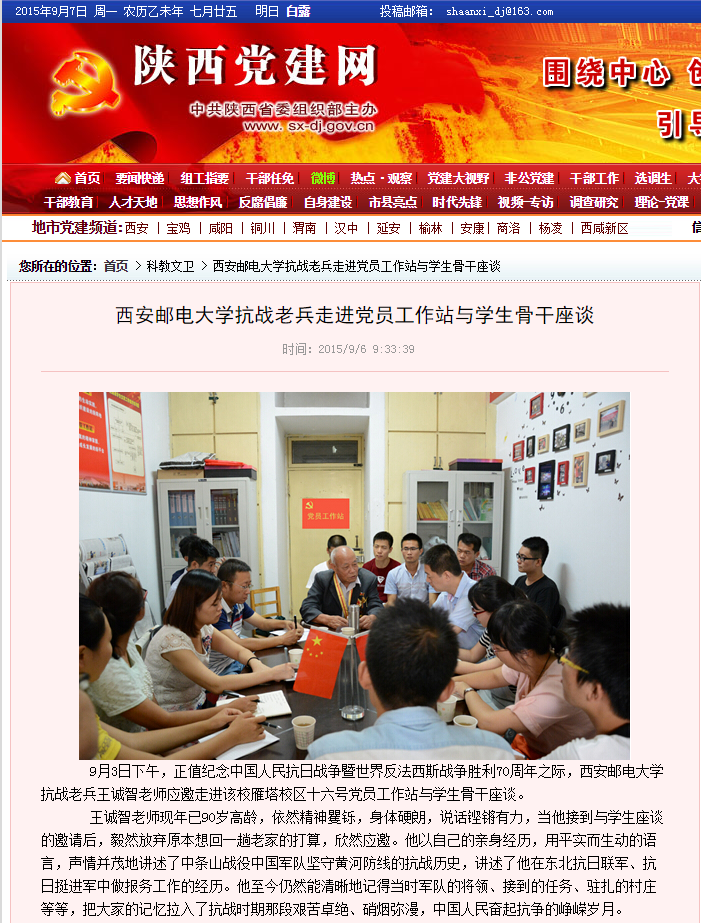 9月3日下午,正值纪念中国人民抗日战争暨世界反法西斯战争胜利70周年之际,必赢76net线路官网抗战老兵王诚智老师应邀走进该校雁塔校区十六号党员工作站与学生骨干座谈。