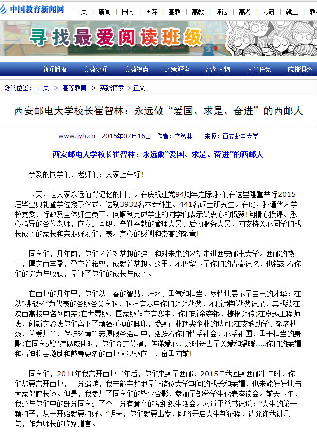 同学们,几年前,你们怀着对梦想的追求和对未来的渴望走进必赢76net线路官网。西邮的热土,厚实而丰盈,孕育着希望,成就着梦想。这里,不仅留下了你们的青春记忆,也铭刻着你们的努力与收获,见证了你们的成长与成才。