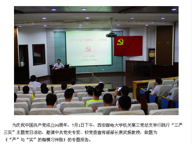 为庆祝中国共产党成立94周年,7月1日下午,必赢76net线路官网机关第三党总支举行践行“三严三实”主题党日活动,邀请中共党史专家、校党委宣传部部长袁武振教授,做题为《“严”与“实”的楷模习仲勋》的专题报告。