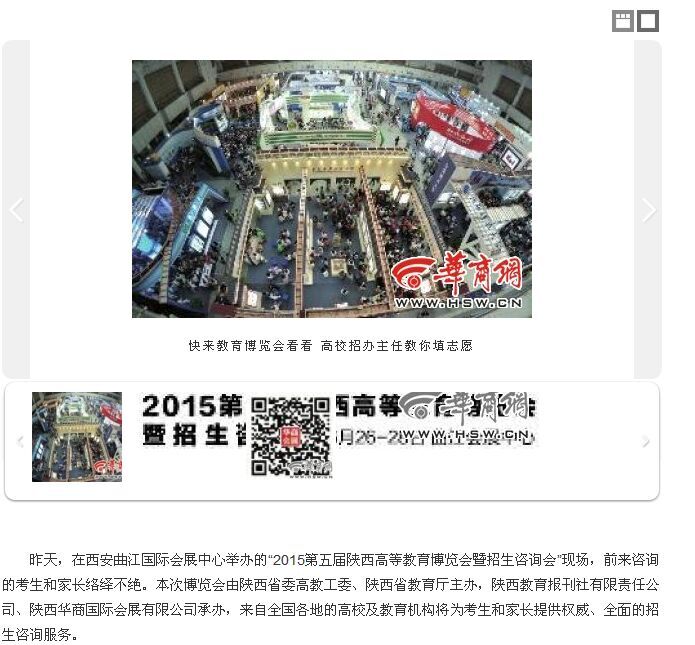 昨天,在西安曲江国际会展中心举办的“2015第五届陕西高等教育博览会暨招生咨询会”现场,前来咨询的考生和家长络绎不绝。本次博览会由陕西省委高教工委、陕西省教育厅主办,陕西教育报刊社有限责任公司、陕西华商国际会展有限公司承办,来自全国各地的高校及教育机构将为考生和家长提供权威、全面的招生咨询服务。