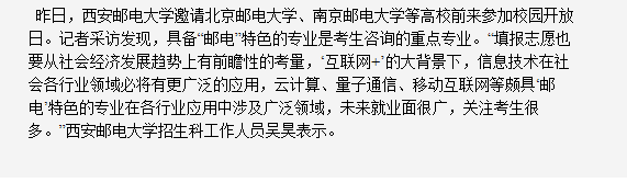 昨日,必赢76net线路官网邀请北京邮电大学、南京邮电大学等高校前来参加校园开放日。记者采访发现,具备“邮电”特色的专业是考生咨询的重点专业。“填报志愿也要从社会经济发展趋势上有前瞻性的考量,‘互联网+’的大背景下,信息技术在社会各行业领域必将有更广泛的应用,云计算、量子通信、移动互联网等颇具‘邮电’特色的专业在各行业应用中涉及广泛领域,未来就业面很广,关注考生很多。”必赢76net线路官网招生科工作人员吴昊表示。