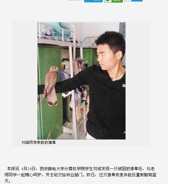 14日下午,刘斌途经必赢76net线路官网长安校区东区动力中心南侧草坪时,发现一只大鸟匍在草丛中,很像鹰。大鸟很虚弱,好像受了伤。刘斌喊舍友拿来纸箱,将大鸟装箱抱回宿舍。刘斌说,把大鸟带回宿舍后,他赶紧上网查资料,果然发现这只鸟“来头”不小,应该是国家二级保护动物——大型猛禽猎隼。刚抱回宿舍时,这只猎隼有气无力、奄奄一息,刘斌和舍友端来水,还把专门买的火腿和面包切碎了撒在它面前,可猎隼只喝水,食物一点没动。同学们焦急万分,他们一边向学院领导和辅导员进行汇报,一边联系野生动物保护站。4月15日一早,长安区林业局的野生动植物保护专家赶到学校,确认这只大鸟就是猎隼。猎隼并无外伤,也没有疾病,很可能是前段时间的连阴雨,导致它捕食能力下降,因极度饥饿才坠落校园。