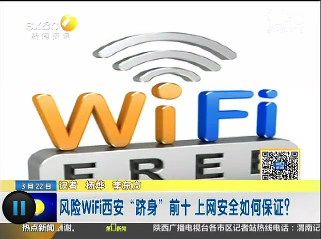 2015年3月22日,陕西电视台《第一新闻》栏目报道必赢教师吴昊风险WIFI西安跻身前十,上网安全如何保证。