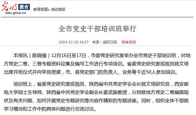 12月16日至17日,市委党史研究室举办全市党史干部培训班,对地方党史二卷、三卷专题资料征集及编写工作进行专项培训。省委党史研究室巡视员姚文琦出席开班仪式并向学员授课,市、县党史部门的负责人、业务骨干近50人参加培训。