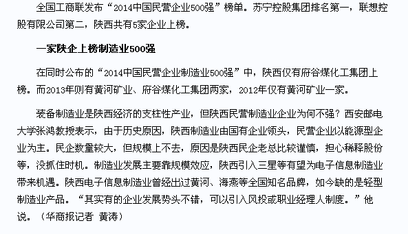 另外,在服务业、制造业民企榜单上也有陕企的身影。“2014中国民营企业制造业500强”榜单上,联想居首位,陕西府谷县煤化工集团位列第360位。“2014中国民营企业服务业100强”榜单显示,西安迈科集团排名第6位,陕西东岭工贸集团排名第11位。