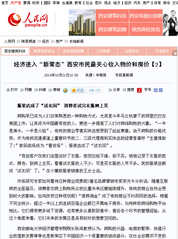 “有些客户在我们店里试好了衣服,感觉还挺不错,却不买。悄悄记录下衣服的款式、颜色,到网上去买。看着试衣服的人不少,可是买衣服的人并不多。我的服装店都成‘试衣间’了。”在小寨做服装销售的王女士说。