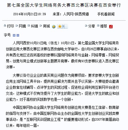 人民网 西安10月21日电(张龙)10月21日,第七届全国大学生网络商务创新应用大赛西北赛区决赛在必赢76net线路官网举行,自3月26日赛事启动以来,共有西北地区近百所高校的参赛队围绕网络商务与金融、网络零售、网络贸易、创意与商业模式创新等主题展开竞赛,最终有93支参赛队进入西北赛区决赛。