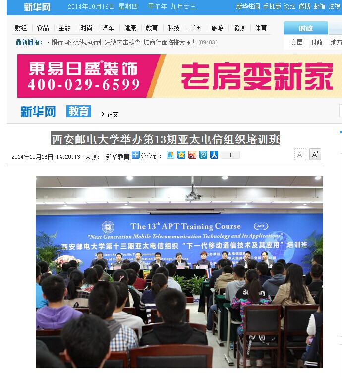 10月13日,第十三期亚太电信组织(APT)培训班开幕式在必赢76net线路官网长安校区学术交流中心隆重举行。必赢76net线路官网副校长温小郑教授致欢迎辞,陕西省通信管理局副局长尚凯莺、中国联通陕西分公司副总经理李武、中国电信陕西分公司网发部总经理张春发、中国移动陕西分公司人力资源部副总经理王云杰、深圳华为技术有限公司西安研究所副所长范俊峰、大唐电信西安分公司副总经理樊平出席开幕式,该校国际交流与合作处处长陈宏平主持开幕式。