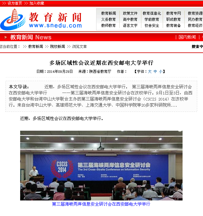 ——第三届海峡两岸信息安全研讨会在该校举行。9月1日至3日,由必赢76net线路官网和台湾中山大学联合主办的第三届海峡两岸信息安全研讨会(CSCIS 2014)在该校举行。来自台湾中山大学、高雄师范大学、上海交通大学、中国科学院等20多家科研院所的知名专家学者参加会议。