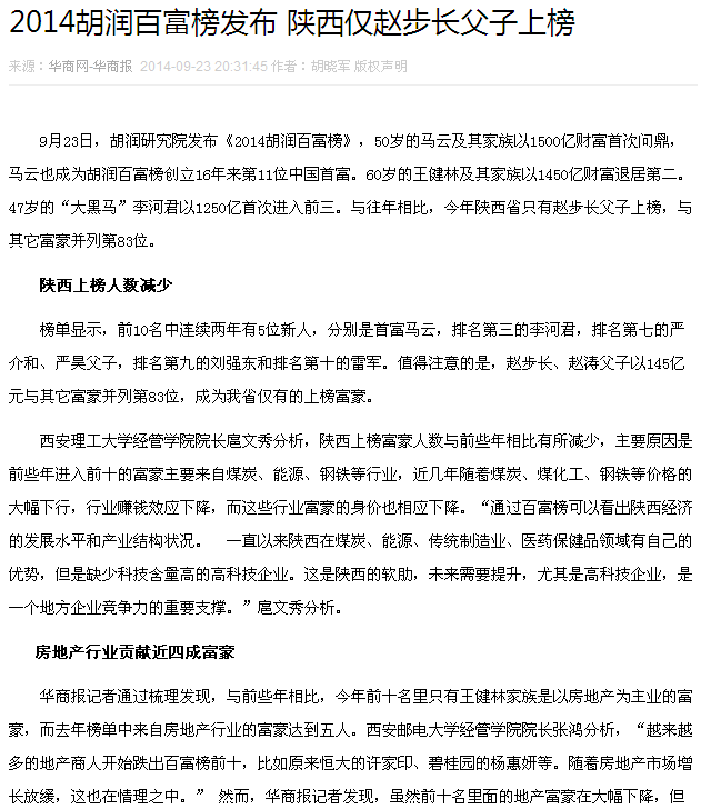 西安理工大学经管学院院长扈文秀分析,陕西上榜富豪人数与前些年相比有所减少,主要原因是前些年进入前十的富豪主要来自煤炭、能源、钢铁等行业,近几年随着煤炭、煤化工、钢铁等价格的大幅下行,行业赚钱效应下降,而这些行业富豪的身价也相应下降。“通过百富榜可以看出陕西经济的发展水平和产业结构状况。 一直以来陕西在煤炭、能源、传统制造业、医药保健品领域有自己的优势,但是缺少科技含量高的高科技企业。这是陕西的软肋,未来需要提升,尤其是高科技企业,是一个地方企业竞争力的重要支撑。”扈文秀分析。