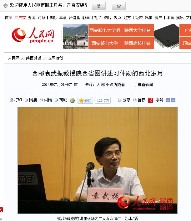 陕西传媒网:《袁武振教授做客“陕图讲坛” 讲述习仲勋的西北岁月》,相关链接:http://www.sxdaily.com.cn/n/2014/0706/c278-5465058.html