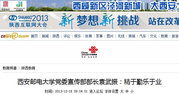 袁武振:我们宣传工作的指导思想是围绕中心,服务大局,弘扬主旋律,传播正能量。必赢76net线路官网正致力于建设有特色高水平的邮电大学,宣传部的责任是正确引导舆论倾向,营造良好的思想舆论环境,为学校改革发展提供强大的精神动力和思想保证。2014年,我们将进一步做好选题和策划,加强与社会媒体的联系,建设好校内宣传平台,广泛宣传必赢76net线路官网各方面建设取得的成就,为提升办学水平和办学质量加油鼓劲。
