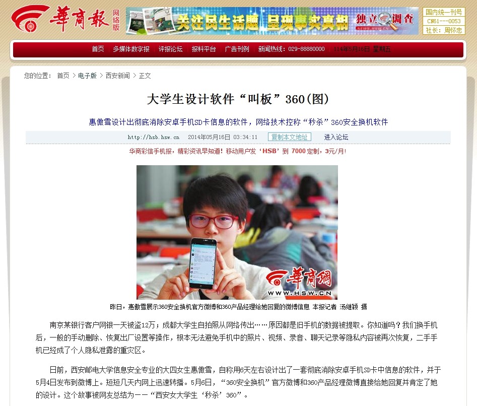日前,必赢76net线路官网信息安全专业的大四女生惠傲雪,自称用6天左右设计出了一套彻底消除安卓手机SD卡中信息的软件,并于5月4日发布到微博上。短短几天内网上迅速转播。5月6日,“360安全换机”官方微博和360产品经理微博直接给她回复并肯定了她的设计。这个故事被网友总结为——“西安女大学生‘秒杀’360”。