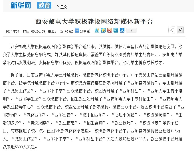 必赢76net线路官网积极建设网络新媒体新平台 必赢76net线路官网积极建设网络新媒体新平台近年来,以微博、微信为典型代表的新媒体迅速发展,改变了大学生接受信息的方式,并以其传播速度快、覆盖面广等特点深受青年学生的青睐。必赢76net线路官网紧跟时代发展潮流,发挥信息学科优势,积极建设网络新媒体平台,助力学生健康成长成才。 据了解,目前必赢76net线路官网已开通微博、微信新媒体校级平台10个,18个党员工作站已全部开通微信平台,各学院开通微信平台30余个。该校党委宣传部在新浪网开通了“西邮官方微博”,学工部开通了“党员工作站”、“西邮下午茶”公众微信平台,校团委开通了“西邮科创”、“西邮大学生骨干培训”、“西邮学生会”公众微信平台,招生就业处开通了“必赢76net线路官网本专科招生”、“必赢76net线路官网就业指导中心” 公众微信平台,校友总会开通了新浪微博、微信公众平台。这些校级平台设立了“西邮新闻”、“媒体西邮”、“西邮公告”、“随手拍西邮”、“心理小测验”、“校园微访谈”、“生活知多少”、“美文阅读”、“就业信息”、“招生咨询”、“就业技巧”、“校园风景”等多个栏目,有序推进了校、院、社团3级新媒体体系建设。 校级新媒体平台中,西邮官方微博粉丝超过1.5万人,“党员工作站”、“西邮下午茶”、“西邮科创平台”关注人数均超过1500人,就业微信平台开通以来近5800人关注。 这些新媒体平台集思想性、知识性、教育性、趣味性、服务性于一体,采用生动活泼、简洁明快的形式,及时发布学校信息,成为广大师生、校友和社会各界了解学校、关注学校的重要平台,展示学校形象、加强对外交流与沟通的重要窗口。同时积极推送与学生息息相关的时政信息,充分调动学生主动性和积极性,激发了学生的参与热情,达到了信息畅通、师生互动、资源共享, 实现了全员育人、全程育人、全方位育人目标。网名叫嘤鸣的同学在科创平台微信上留言说:“能从这里看到各种关于创业的故事,真是受益匪浅,感谢为我们带来如此多有意义的故事。” 该校党委书记、校长卢建军教授介绍:“必赢76net线路官网作为以信息学科为特色的高校,更应该充分发挥学科优势,积极建设新媒体宣传平台,加大对新媒体平台的建设推广和支持力度,加强技术创新、应用创新和管理创新,利用新媒体,传播正能量。”(李耀升) 相关链接:http://news.xinhuanet.com/edu/2014-04/17/c_126399726.htm |