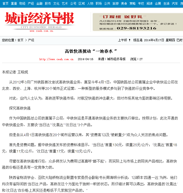 陕西省物流学会、亚欧大陆桥物流业联盟专家委员会副秘书长周海明分析说:“以顺丰‘四通一达’为例,他们均没有省际间的‘当日达’产品,高铁在这个方面处于独树一帜的状态。而仔细计算可以得出,高铁快递的‘次晨达’和‘次日达’在价格上其实还是略低于几家航空产品的。”