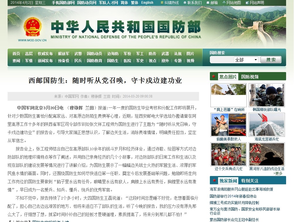 相关链接:http://www.mod.gov.cn/cadets/2014-03/20/content_4498641.htm