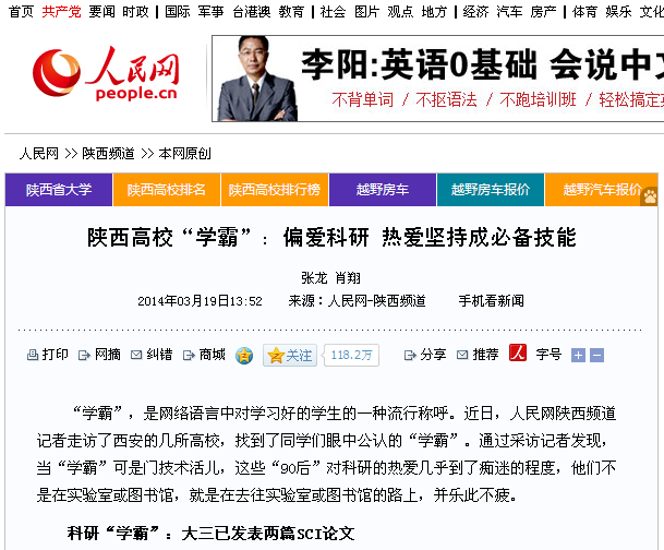 “学霸”,是网络语言中对学习好的学生的一种流行称呼。近日,人民网陕西频道记者走访了西安的几所高校,找到了同学们眼中公认的“学霸”。通过采访记者发现,当“学霸”可是门技术活儿,这些“90后”对科研的热爱几乎到了痴迷的程度,他们不是在实验室或图书馆,就是在去往实验室或图书馆的路上,并乐此不疲。