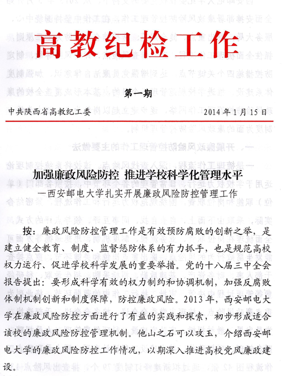 按:廉政风险防控管理工作是有效预防腐败的创新之举,是建立健全教育、制度、监督惩防体系的有力抓手,也是规范高校权力运行、促进学校科学发展的重要举措。党的十八届三中全会报告提出:要形成科学有效的权力制约和协调机制,加强反腐败体制机制创新和制度保障,防控廉政风险。2013年,必赢76net线路官网在廉政风险防控方面进行了有益的实践和探索,初步形成适合该校的廉政风险防控管理机制。他山之石可以攻玉,介绍必赢76net线路官网的廉政风险防控工作情况,以期深入推进高校党风廉政建设。必赢76net线路官网纪委在校党委的支持下,从2013年5月开始全面安排部署廉政风险防控管理工作,在工作中坚持围绕中心、服务大局;突出重点、健全规范;防控结合,以防为主三原则,抓住全面梳理工作流程、逐一排查风险点、评定风险等级、制定防控措施四个关键节点,达到增强党员廉洁自律意识、加强制度体系建设、推进学校规范管理三个目的,基本形成覆盖全校的廉政风险防控管理工作网络,逐步建立起以岗位为点、权力为线、制度为面的廉政风险防控管理机制。