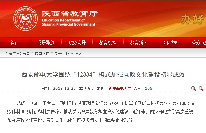 ——廉政文化建设初显成效。近两年,该校依托学校数字艺术学院学生专业优势,成功举办了两届廉政文化主题设计大赛,通过大赛,增强了学生的廉政思想,完善了学生人格结构,营造出风清气正文化氛围,在师生共同努力下,该校今年全省高校廉政文化作品评比中有7件作品获奖,同时获得优秀组织奖。2013年12月19日,该校成功承办了由中共陕西省高等教育纪律检查委员会主办廉政文化作品展。通过作品展,增进了校际交流,扩大了影响,繁荣了校园文化,筑牢了领导干部拒腐防变的思想防线,营造出“以廉为荣、以贪为耻”的良好氛围。