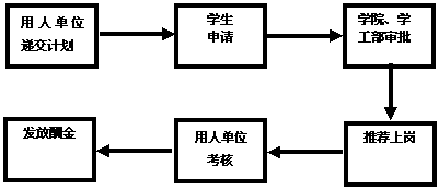 用人单位递交计划:校内各需要设立勤工助学岗位的单位向学生工作部呈报所需岗位的情况。学生工作部对各部门呈报的岗位人数进行核实,确定岗位。并按各学院学生人数比例将岗位进行分配。